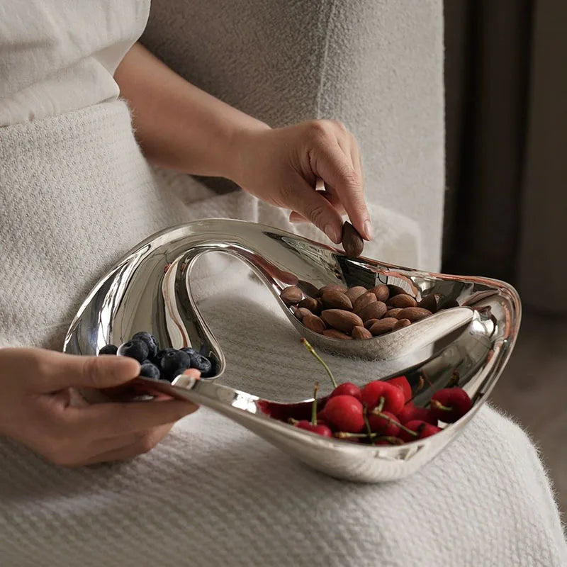 A true statement of modern sophistication. With its fluid, organic curves and mirror-polished finish, this piece seamlessly blends artistry and functionality. Perfect for serving delicacies like fresh berries, nuts, or gourmet treats, it also doubles as an elegant centerpiece, reflecting light beautifully in any setting.